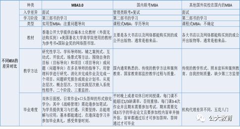 ★MBA学位全球认可 MBA3.0选择的基本教材除了美国著名商学院使用最多的翻译教材;还有香港政府斥资1亿元,全球招标打造的、由本地及海外资深学者及专家根据香港及大中华地区的商业环境精心设计和编制,非常系统且每年不断更新。质量监控与香港的全日制学员相同。 现有在读的在职学员高达11,000余名,至今已有超过16,000名MBA毕业生,大部分校友为内地政府机关、国有企事业、上市企业及大中型民营企业高级管理人员;他们在不同的岗位上发挥着重要的作用。 满足知识更新、专业能力、刷新生活及朋友圈,企业融资上市(对高管的学历披露)、开展国际业务及国际交流与合作、甚至小孩择校、签证申请、海外参与及移民加分等现实需求;面试入学,研究生无需参加国家统考,节约大量备考时间;尽管国际化大学实行教、考、评分离,但一旦“三个打通”就“一通百通”;经过近二十年努力,求是院学员的毕业率已经从50%左右上升到90%以上,只要认真与坚持,几乎都可获得全球认可的硕士学位证书。不仅将管理科学的“道、法、术”进行系统性科学性的升华,并享受新思想、新知识、新方法、新朋友带来的满满的乐趣及成就感和自信,焕然一新地面向未来。 六、MBA3.0与MBA的比较:MBA的本土化、应用化